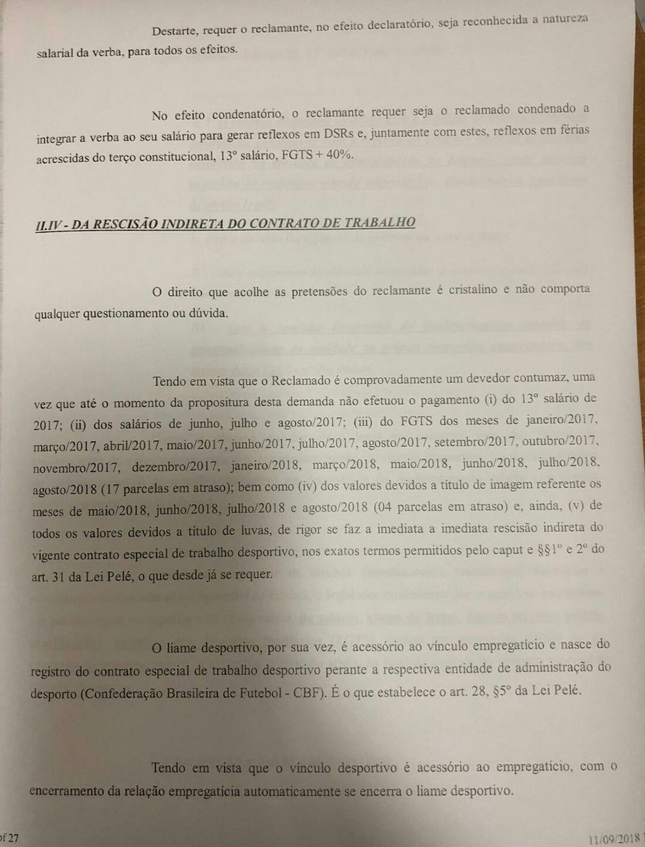 Além do depósito do FGTS, Wagner também reclama 4 meses de direitos de imagem, luvas e salários de 2017 (incluindo 13°). No processo, também questiona os 2 contratos assinados pelo meia. Um com a pessoa física, que seria do salário e outro pj relativo à imagem #futgloboradio