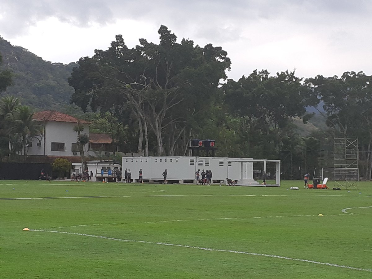 Após assistirem a um vídeo sobre o Flamengo, jogadores começam a aparecer no campo. Imprensa só vai acompanhar o aquecimento. #gevas
