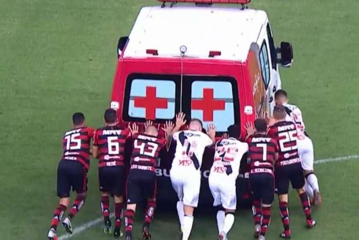 Os jogadores do Flamengo e do Vasco passaram por uma cena inusitada neste sábado. Eles tiveram que empurrar a ambulância que entrou no gramado para atender o vascaíno Bruno Silva, que precisou de atendimento médico de emergência. Aparentemente o veículo teve uma pane e precisou da ajuda dos atletas.
