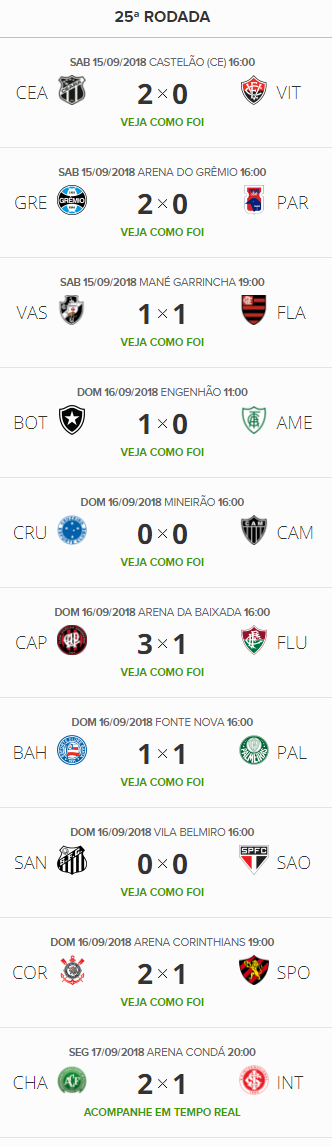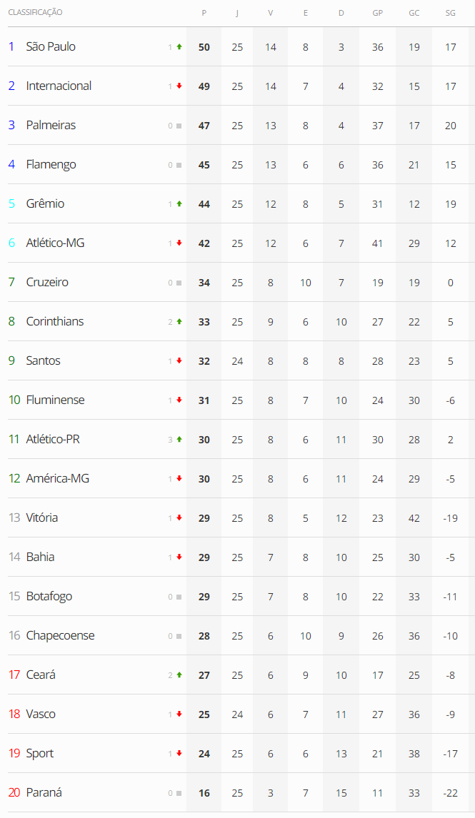 Terminados os jogos da 25ª rodada do Campeonato Brasileiro, o Vasco, que empatou com o Flamengo por 1 a 1, caiu para a 18ª colocação na classificação e está no Z4, a 3 pontos do 1º clube fora da zona de rebaixamento, e a 17 pontos do G6.