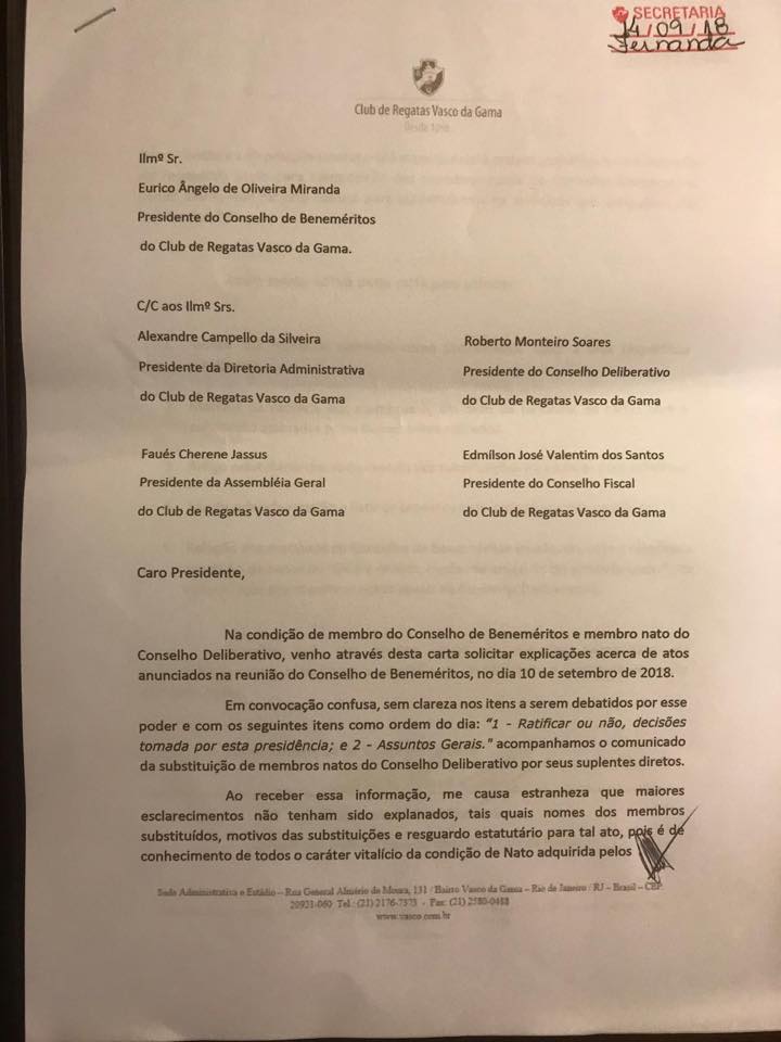Deixamos aqui nossa insatisfação e repulsa aos atos cometidos e solicitando que sejam corrigidos para respeito ao Vasco e seus associados, nos colocando sempre contra acordos obscuros e prejudiciais ao nosso clube.