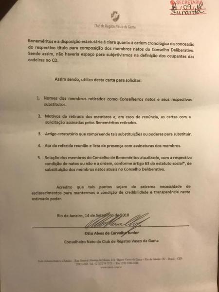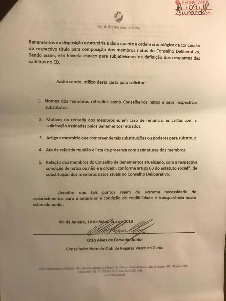 Demonstrando nossa contrariedade, protocolamos na sexta-feira, dia 14 de setembro, uma carta assinada pelo nosso membro e conselheiro nato Otto de Carvalho, solicitando explicações de tais atos.