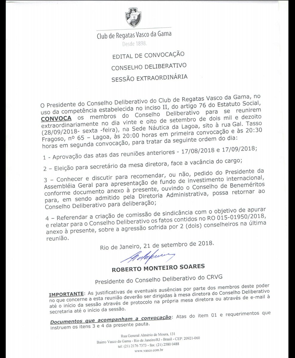 Conselho Deliberativo do Vasco convocado para a próxima sexta-feira para debater a proposta de fundo de investimento de Julio Brant. #gevas