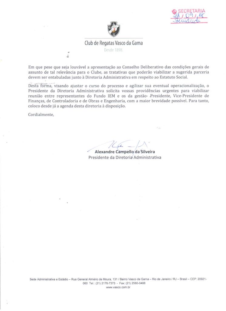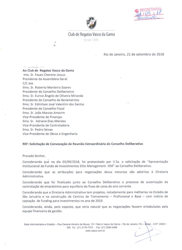 Em paralelo à convocação, Alexandre Campello solicitou uma reunião entre representantes do fundo de investimento e a diretoria do Vasco. #gevas