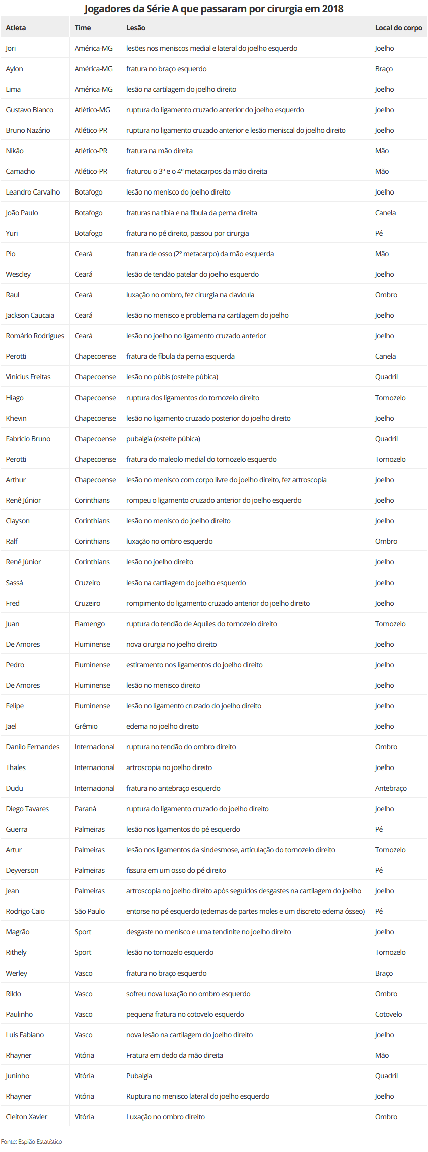 A coxa, de fato, é o local que mais provocou baixas médicas na temporada. Porém, nenhum dos atletas contundidos na coxa precisou de cirurgia. Do outro lado, das 101 contusões no joelho na elite do futebol brasileiro, um quarto delas necessitou de procedimento cirúrgico: 26.