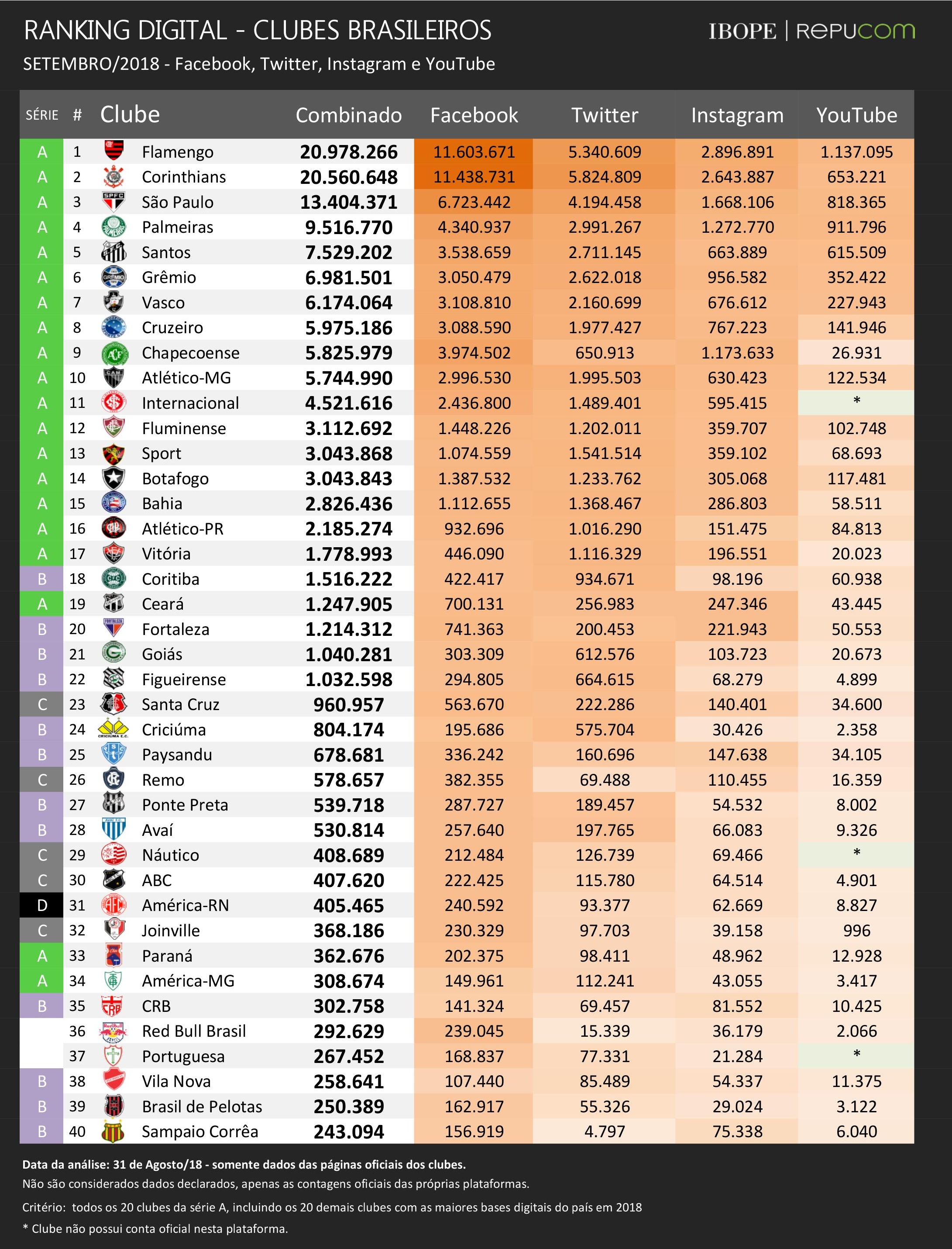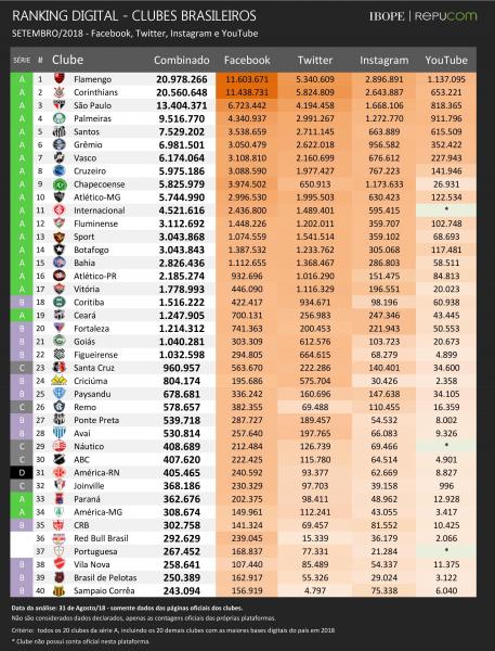 O Flamengo foi a equipe que mais somou novos seguidores no último mês. O rubro-negro agregou 171 mil inscritos em suas contas oficiais, aumentando a diferença para o vice-líder Corinthians. Atualmente, cerca de 400 mil inscritos separam cariocas e paulistas. O clube da Gávea também apresentou o maior volume de crescimento entre todos os clubes no Twitter, agregando 31 mil novos inscritos.