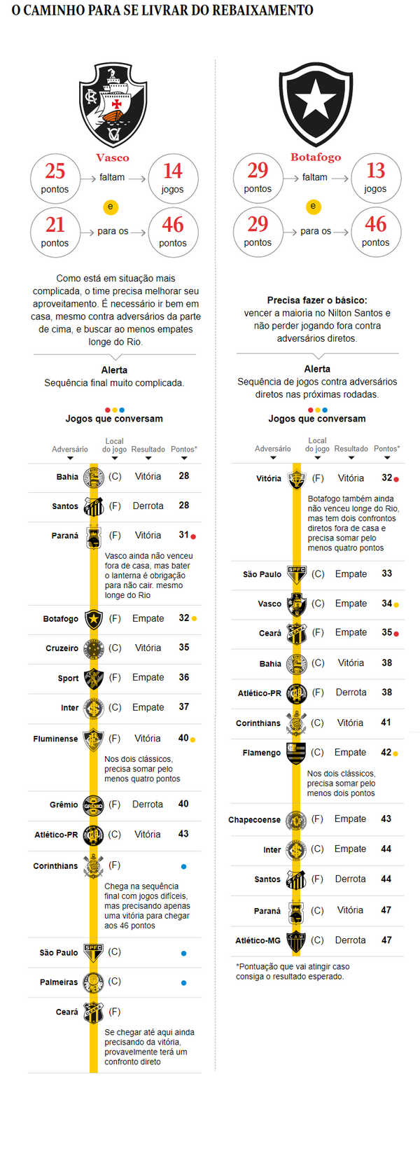 O campeonato se aproxima do fim. Faltam 13 jogos para o Botafogo (em 15º, com 29 pontos) e 14 para o Vasco (18º, com 25 pontos, já no Z-4), que cumpre partida atrasada da terceira rodada na quinta, contra o Santos no Pacaembu. Enquanto o torcedor mais otimista sonha com um final de ano feliz, quem sabe beliscando uma vaga em competição sul-americana, alvinegros e cruz-maltinos realistas têm uma única obsessão: chegar aos 46 pontos.