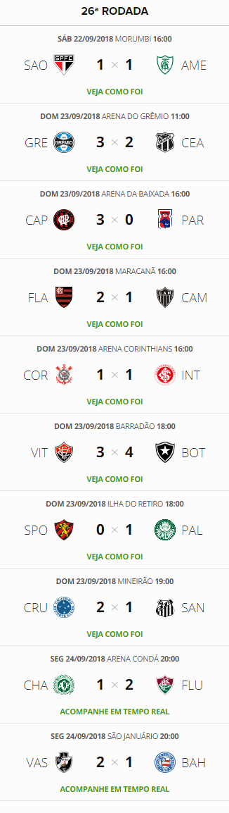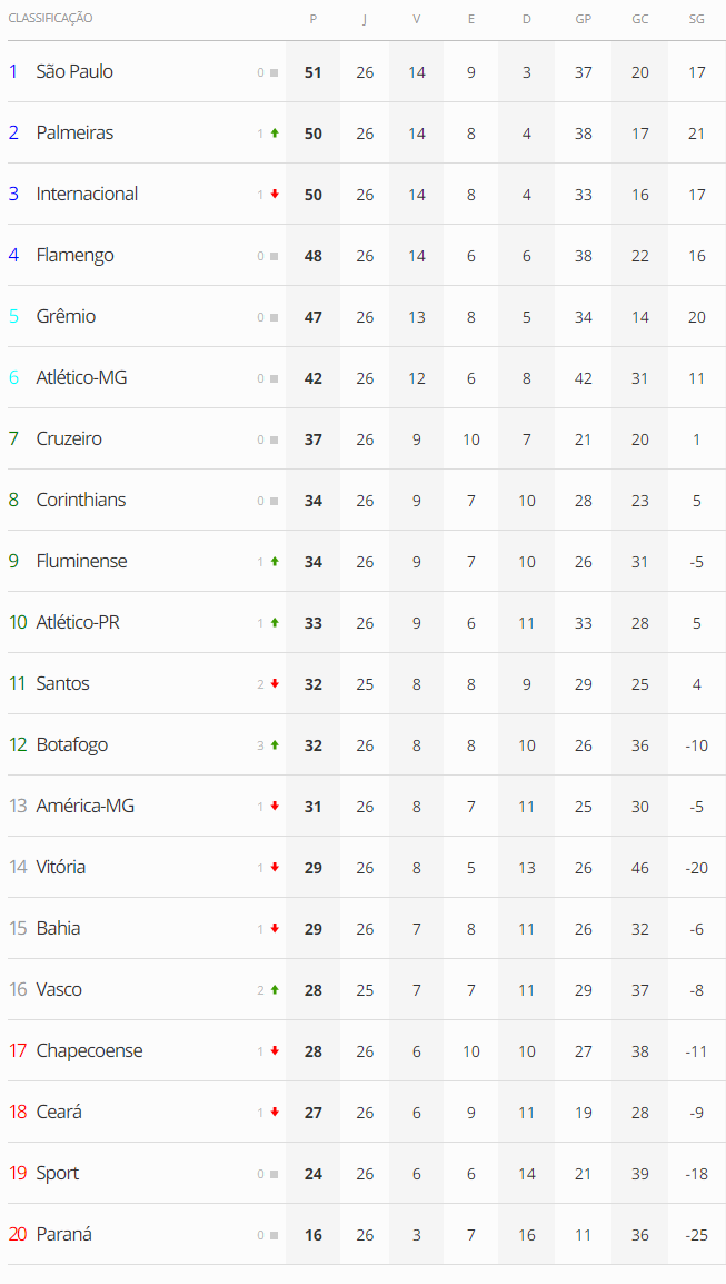 Terminados os jogos da 26ª rodada do Campeonato Brasileiro, o Vasco, que venceu o Bahia nesta segunda-feira em São Januário por 2 a 1, subiu da 18ª para a 16ª colocação na classificação, fora do Z4. O Gigante da Colina tem um jogo a menos, contra o Santos ainda pela 3ª rodada do Brasileiro, que será disputado no Pacaembu na próxima quinta-feira.