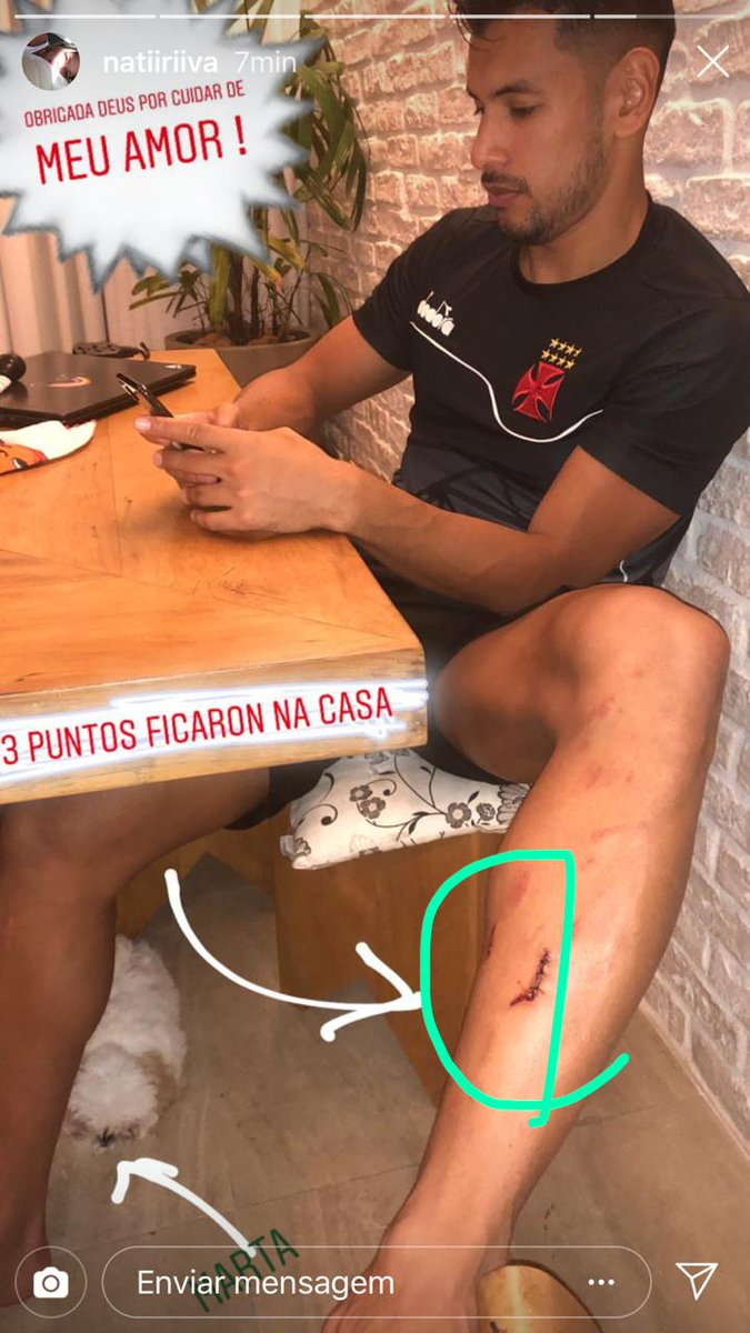 A esposa de Andrés Ríos mostra os pontos que o atacante levou após a entrada de Douglas que originou o pênalti convertido por Pikachu. Falei com pessoas do departamento médico do Vasco e o atacante terá uma proteção para que possa jogar contra o Santos. A princípio, não preocupa.