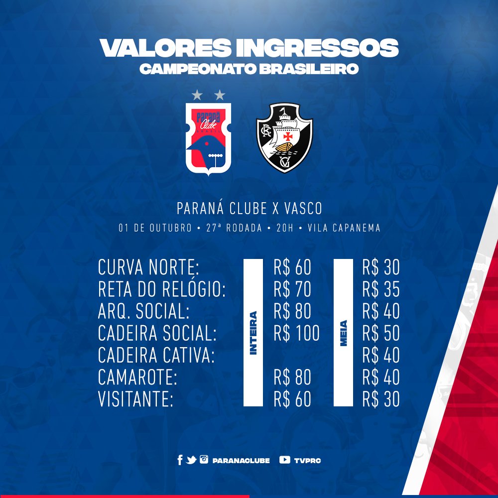 O torcedor paranista tem ainda a comodidade da compra do ingresso online. Estão disponíveis ingressos para Curva Norte, Reta do Relógio, Arquibancada Social e Cadeira. O torcedor do Vasco-RJ também poderá adquirir o seu bilhete pela internet. Acesse: https://ingresso.paranaclube.com.br/