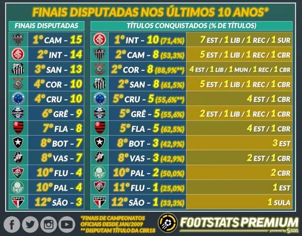 Confira o ranking de finais e títulos conquistados desde 2009: