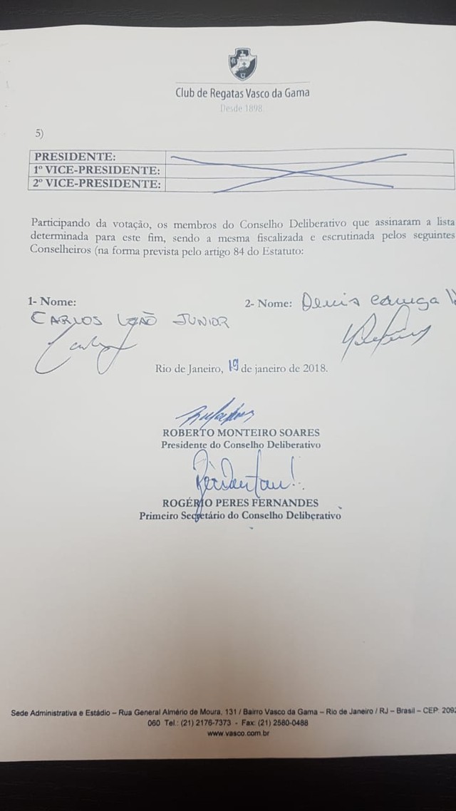 Nesta semana, o departamento jurídico do Vasco entrou com pedido para se tornar parte do processo. Um dos documentos incluídos na petição é o da ata da eleição na Lagoa, que teve Campello como vencedor. Nela, há a inclusão de apenas duas chapas, sem a presença de Fernando Horta.