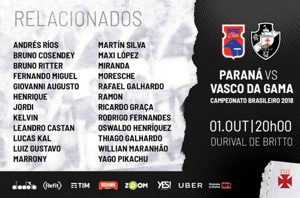 Confira os relacionados do Vasco para o jogo de 2ª-feira contra o Paraná
