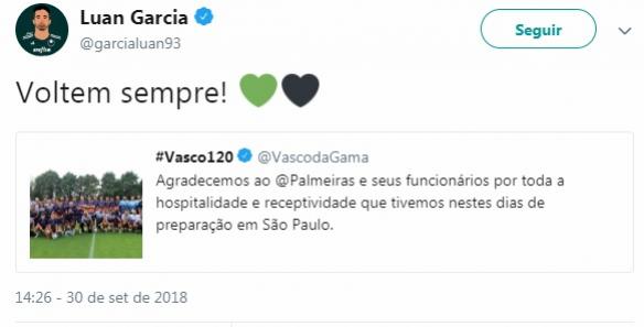 30/09/18 - Vasco, via Twitter: 'Agradecemos ao Palmeiras e seus funcionários por toda a hospitalidade e receptividade'