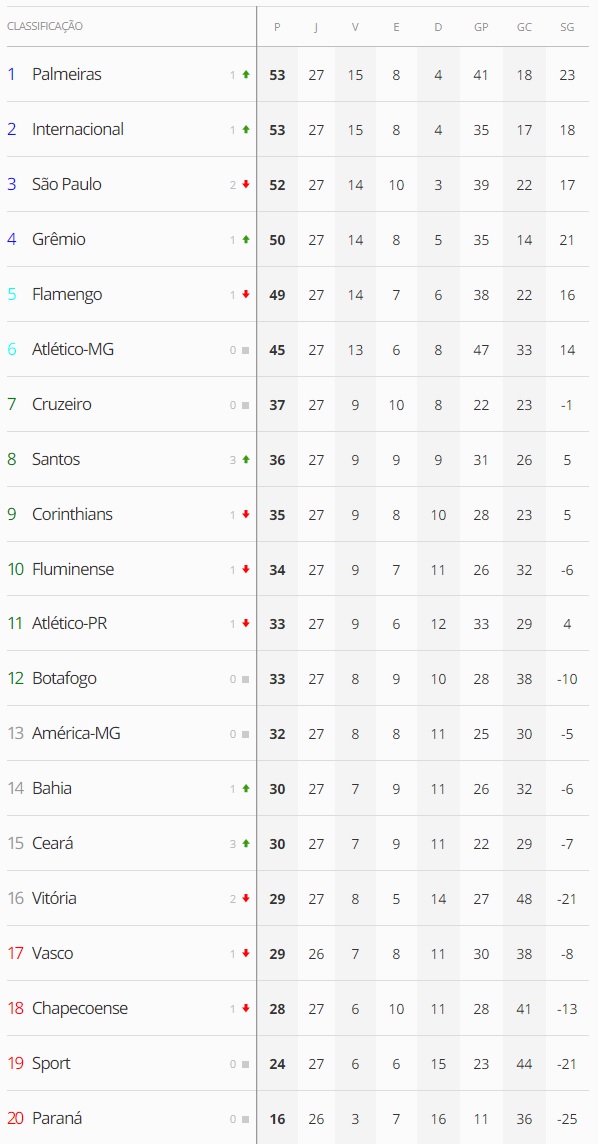 Após os jogos do fim de semana da 27ª rodada do Campeonato Brasileiro, o Vasco voltou à zona do rebaixamento. Porém, se derrotar o Paraná nesta 2ª-feira por 1 ou 2 gols de diferença, subirá para a 14ª colocação, saindo do Z4. Se vencer por 3 ou mais gols de diferença, subirá para o 13º lugar, ultrapassando o América-MG. Mesmo se empatar, o Gigante da Colina deixará o Z4, ultrapassando o Vitória e ficando na 16ª posição.