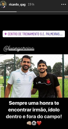 28/08/18 - Hoje no Palmeiras, ex-vascaíno Luan deseja boa sorte a Alberto Valentim: 'Torço demais por você e torcerei ainda mais'