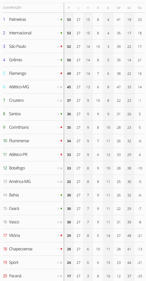 Terminada a 27ª rodada do Brasileiro, o Vasco, que empatou com o Paraná por 1 a 1, manteve-se na 16ª colocação e a 1 ponto do Z4.