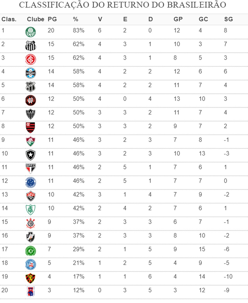 Houve outras duas mudanças no G-4: o Internacional subiu para 3º com os três pontos conquistados diante do Vitória, e o Grêmio entrou na desejada zona de classificação para a Libertadores após bater o Fluminense no Rio de Janeiro. O Ceará, que faz grande campanha de recuperação no returno e, inclusive, deixou a zona de rebaixamento do Brasileirão, subiu duas posições e está entre os cinco melhores neste recorte do campeonato.