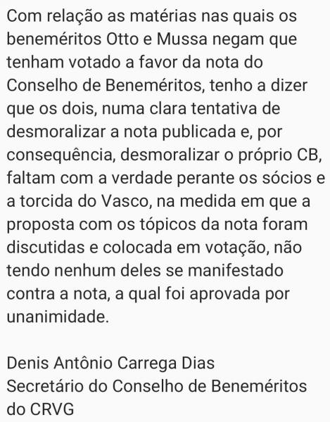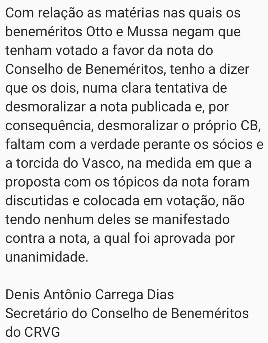 Denis Dias, secretário do Conselho de Beneméritos do Vasco, se pronunciou ao LANCE! após ontem Otto Carvalho e Faues Mussa terem negado aprovação da nota de repúdio contra decisão judicial que anulou a eleição do clube. Dias diz que a dupla "falta com a verdade". Espia #lanceVAS
