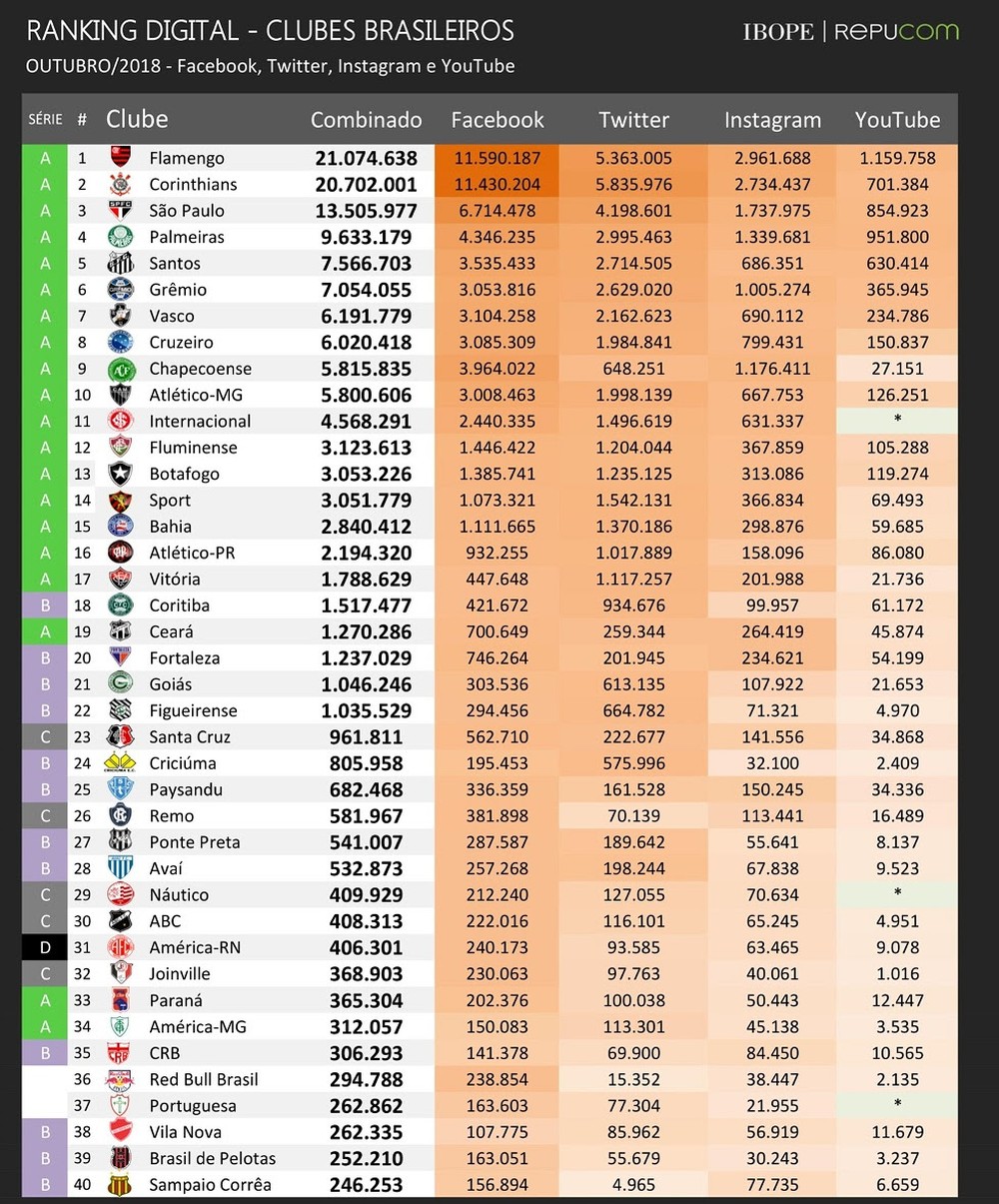 O Flamengo foi o primeiro a bater a marca de 21 milhões de assinantes. Foram 96 mil novas curtidas em setembro. O Corinthians, no mesmo período, agregou 141 mil novas inscrições (91 mil delas no Instagram).