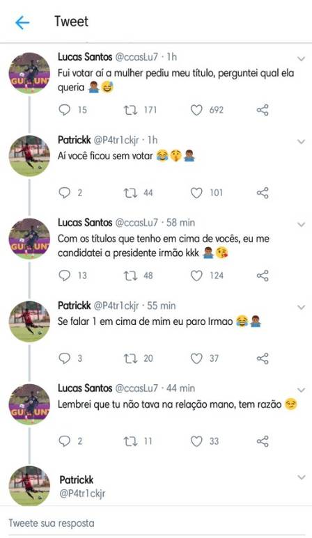 Neste domingo, o atacante Lucas Santos, do sub-20 do Vasco, e o zagueiro Patrick, do sub-20 do Flamengo, que são muito amigos, se provocaram com bastante bom humor no Twitter. Veja abaixo.