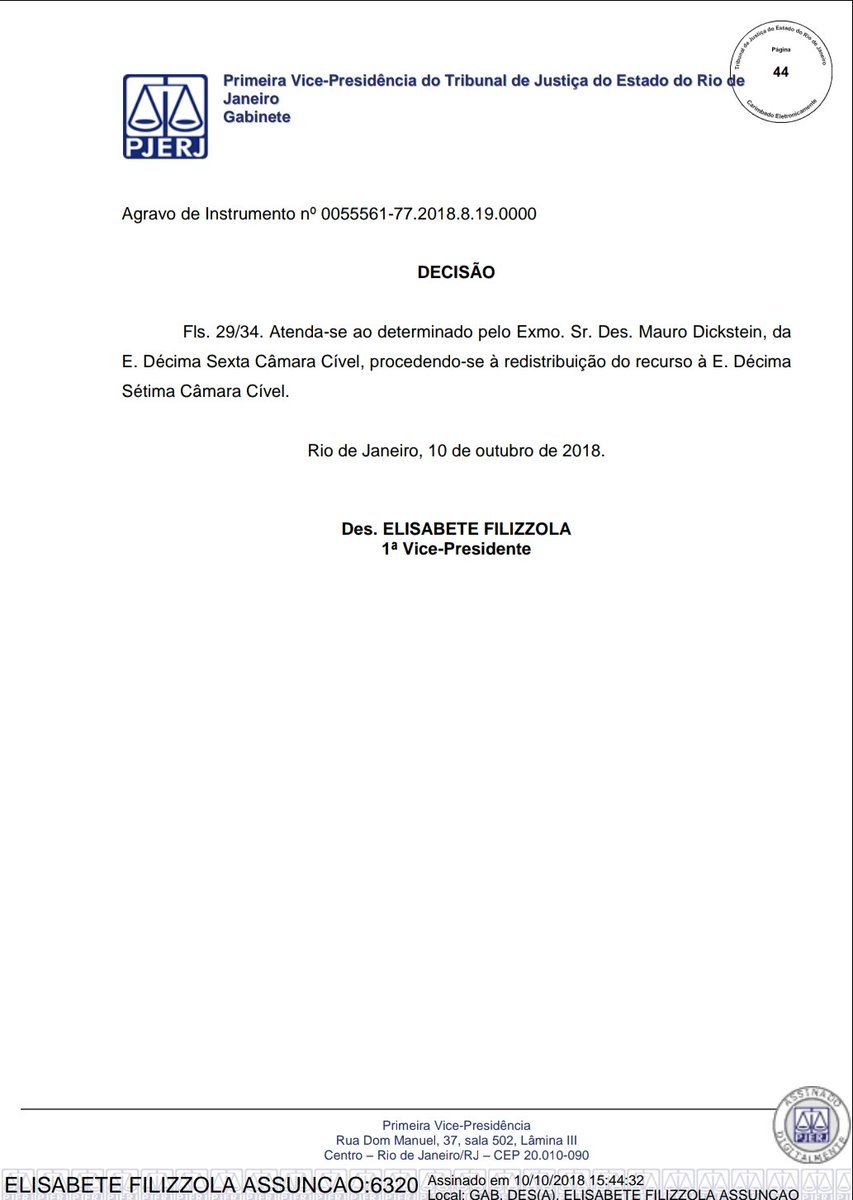 1a VP do TJRJ, desembargadora Elisabete Filizzola confirma pedido de Mauro Dickstein, da 16a Câmara Cível, e também envia recurso do Vasco contra a anulação da eleição para a relatora Márcia Ferreira Alvarenga, da 17a Câmara. Os outros dois recursos já tinham ido ontem #lanceVAS