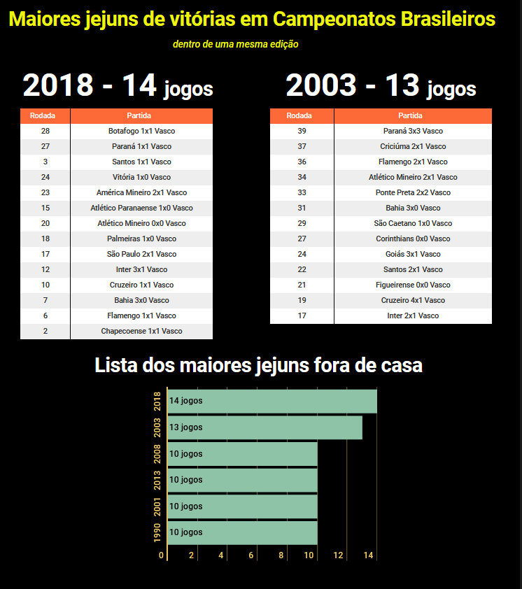 O empate diante do Botafogo por 1×1, em jogo válido pela 28ª rodada do Brasileirão 2018, levou o Vasco a atingir uma marca negativa: o maior jejum de vitórias do clube na história dos campeonatos brasileiros, dentro de uma mesma edição. Já são 14 jogos fora de casa nesta edição, com 7 empates e 7 derrotas. A série atual supera a da campanha de 2013, na qual a equipe ficou 13 partidas sem vencer fora de seus domínios.