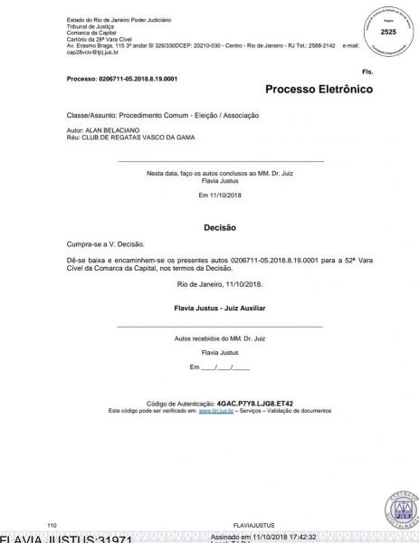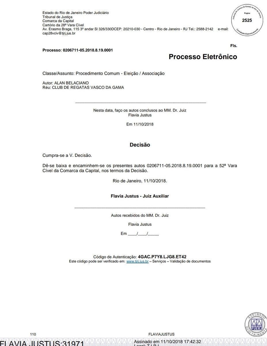 Trâmites da ida da ação que pede a anulação da eleição do Vasco da 28a Vara Cível TJRJ a 52a seguiram nesta 5a - juíza Flávia Justus cumpriu decisão da desembargadora Márcia Alvarenga (abaixo). Como amanhã é feriado, a juíza Maria Cecília só deve receber os autos na 2a #lanceVAS