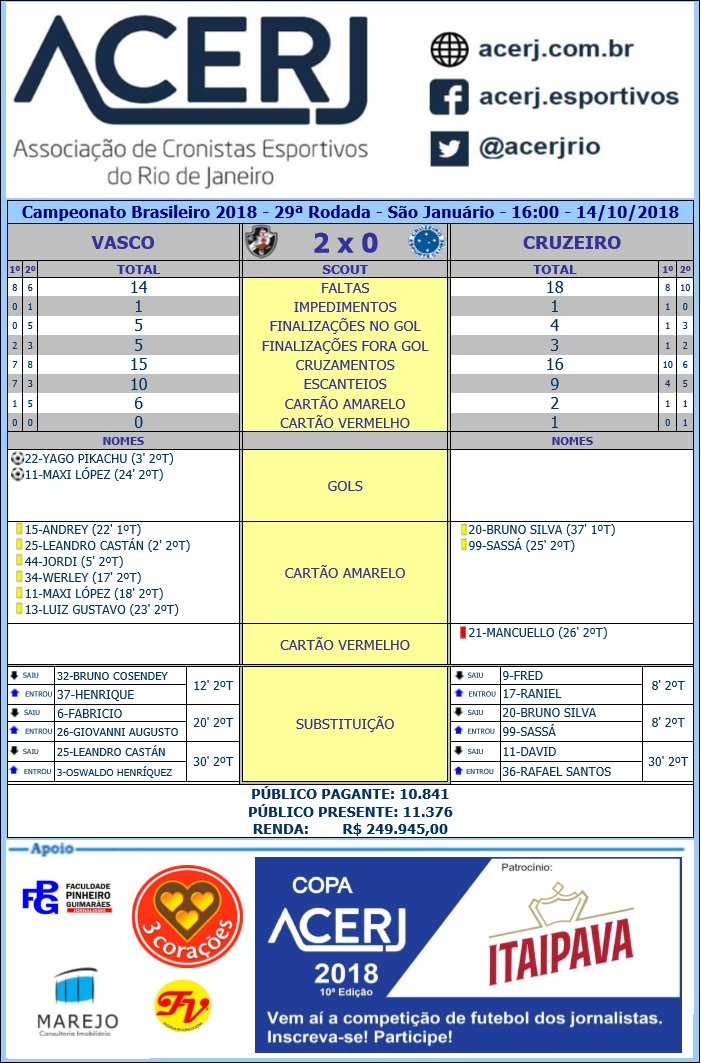 Confira estatísticas de Vasco 2 x 0 Cruzeiro