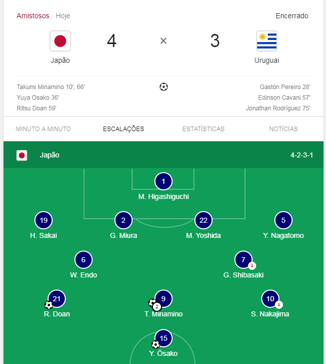 O Japão, que chegou até as oitavas de final da Copa do Mundo da Rússia, recebeu o Uruguai na manhã desta terça-feira e venceu o amistoso internacional por 4 a 3. Mesmo com Cavani e De Arrascaeta como titulares, inclusive com o camisa 21 deixando um tento, os japoneses surpreenderam no estádio Saitama, no Japão, com destaque para a atuação de Takumi Minamino, autor de dois tentos.