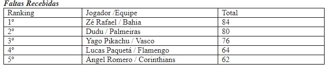 O Campeonato Brasileiro está em sua reta final e muito atletas somam índices positivos, negativos e que despertam a atenção de torcedores e dirigentes. Outro fator que chama a atenção é o número de faltas na competição.