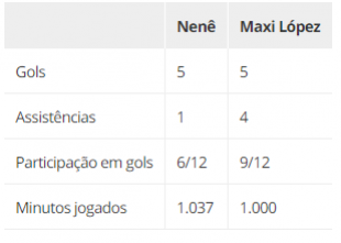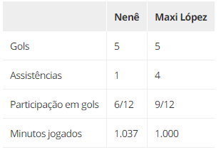 Nenê e Maxi López em seus primeiros 12 jogos no Brasileirão