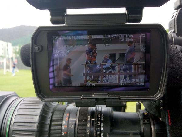 Eurico Miranda levando um papo com Fabrício e Bruno Ritter. No campo o restante dos jogadores realizam aquecimento. #E24Vas