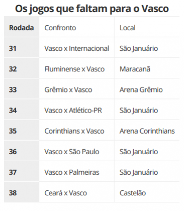 A oito rodadas do fim do Brasileiro, para o Vasco é inevitável fazer contas. Com mais 11 pontos, o time chegaria a 45 e, na teoria, teria boas chances de se livrar do rebaixamento. Para dificultar a missão cruz-maltina, quatro dos atuais cinco primeiros colocados do Brasileiro serão adversários: Internacional, Palmeiras, São Paulo e Grêmio. Destes duelos, apenas o com os gaúchos é fora do Rio de Janeiro.
