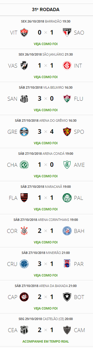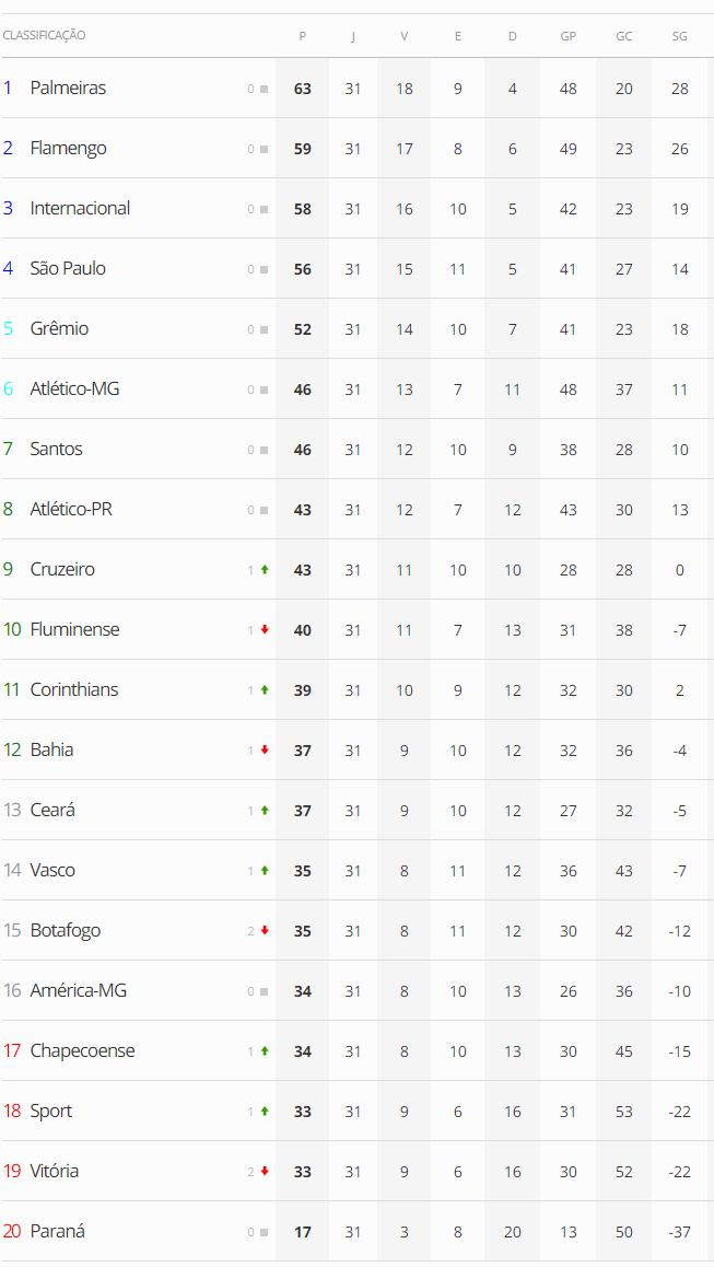 No último jogo da 31ª rodada do Brasileiro, o Ceará derrotou o Atlético-MG por 2 a 1 na noite desta 2ª-feira, no Castelão. Com o resultado, o time cearense ultrapassou o Vasco na classificação. Agora, o Gigante da Colina está em 14º lugar e a apenas um ponto da zona do rebaixamento. Todos os times têm agora o mesmo número de jogos. Faltam 7 rodadas para o fim da competição.