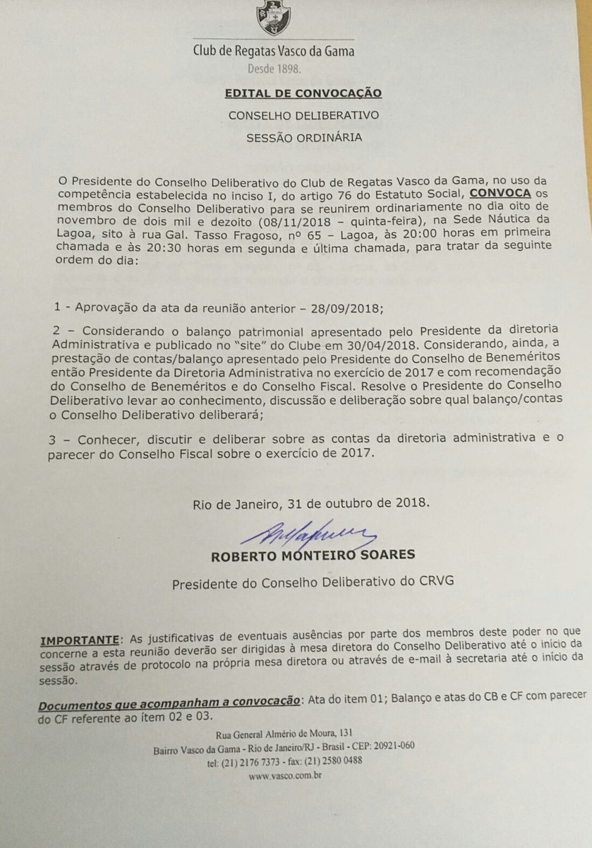 O presidente do Conselho Deliberativo do Vasco, Roberto Monteiro, convocou reunião para o dia 8 de novembro, quinta-feira, para decidir qual balanço será analisado pelos conselheiros. Neste encontro também serão votadas as contas de 2017, já com base no balanço decidido. #gevas