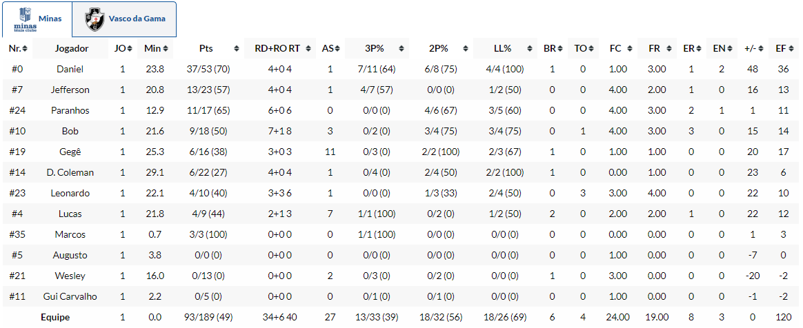 O Vasco entrou em quadra nesta quarta-feira (31/10) para encarar o Minas Tênis Clube, pelo Novo Basquete Brasil e acabou derrotado por 93 a 65. O próximo compromisso do Gigante do Basquete na competição será nesta sexta-feira, às 21h, diante do Paulistano, no Ginásio de São Januário.
