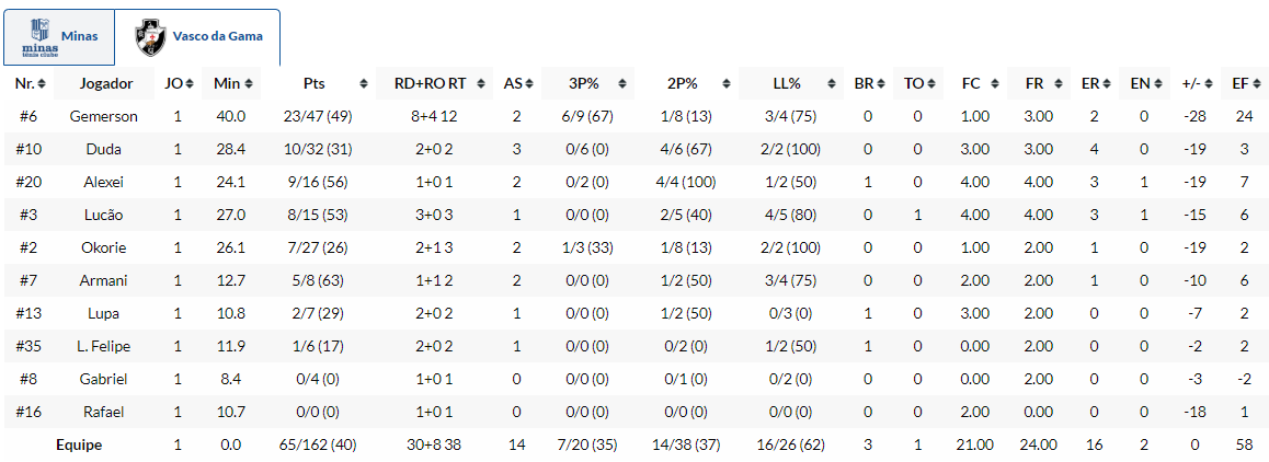 Tudo que deu certo no primeiro quarto, não se manteve no segundo. O Vasco teve dificuldades no ataque e a defesa caiu muito de produção. As mudanças no Minas deram certo e o time conseguiu melhorar o rendimento, fechando o primeiro tempo com 42 a 32 no placar.