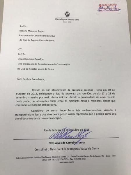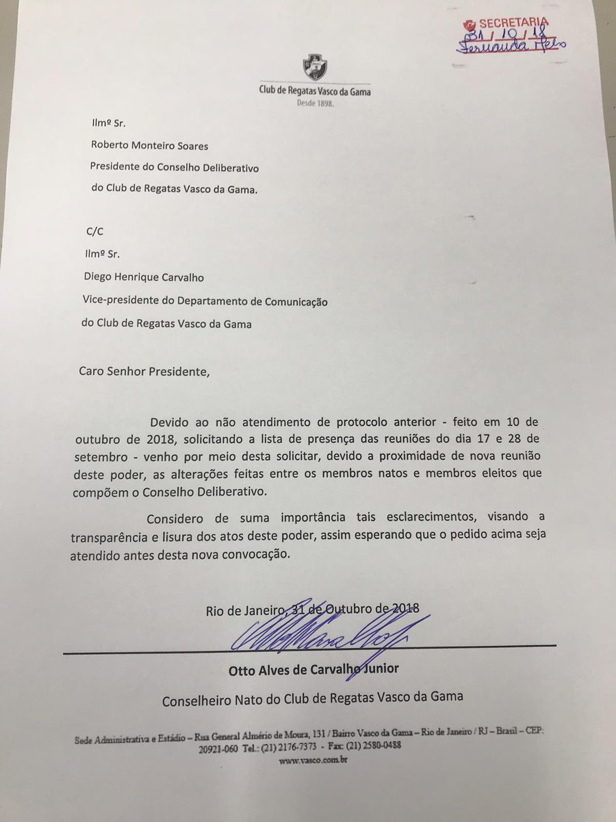 Protocolei hoje a quarta solicitação - 2 para o CB e 2 para o CD - sobre as alterações dos membros natos na composição do Conselho Deliberativo.