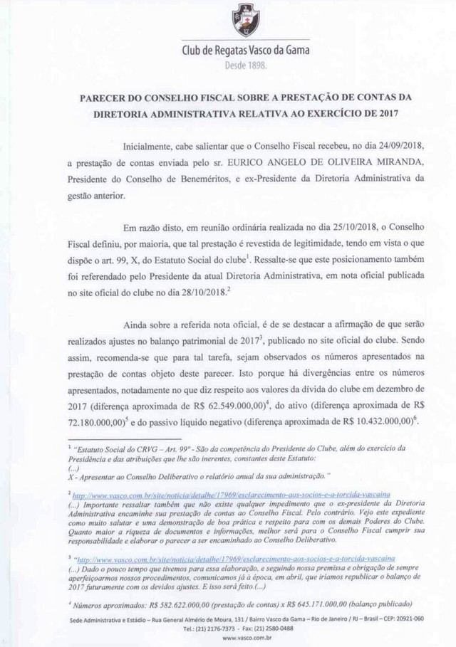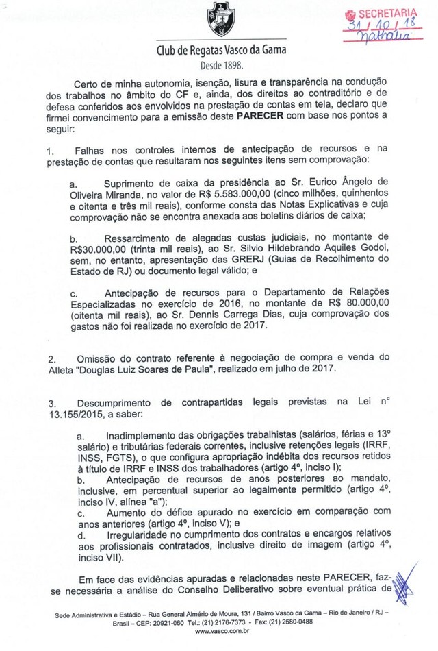 No documento, ele cita prestações sem comprovação, a principal delas de cerca de R$ 5 milhões, relativas ao "suprimento de caixa da presidência" de Eurico, e omissão contrato de compra e venda do volante Douglas Luiz ao Manchester City, em julho de 2017.