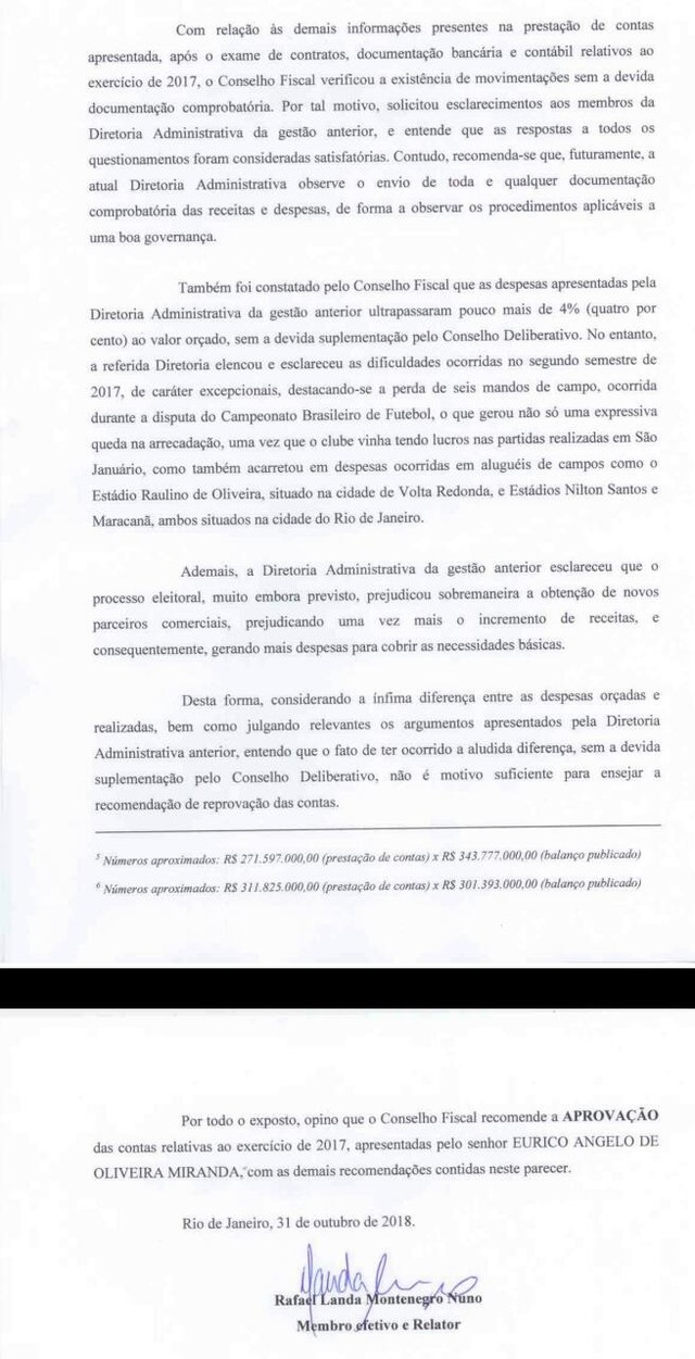 O Conselho Fiscal do Vasco recomendou, na quarta-feira, a aprovação das contas apresentadas por Eurico Miranda em relação ao ano de 2017. A decisão foi tomada por maioria, com dois membros favoráveis (Edmilson Valentim e Rafael Landa) e um contrário (Otto Carvalho).