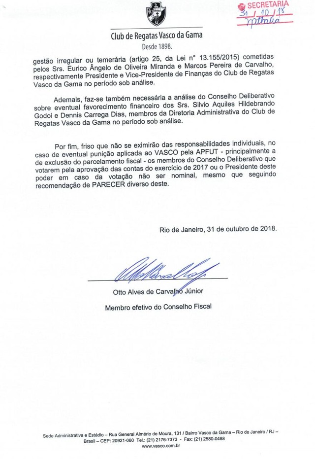 Otto, por sua vez, protocolou na secretaria do clube um parecer independente, no qual recomenda a reprovação com responsabilização das contas.