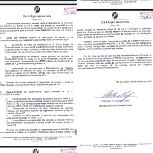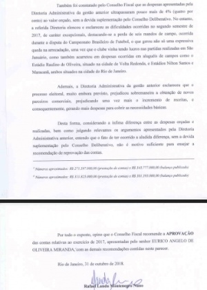 Tal documento é assinado por Rafael Landa, relator da análise das contas, e não pelo presidente do Conselho Fiscal, Edmilson Valentim.