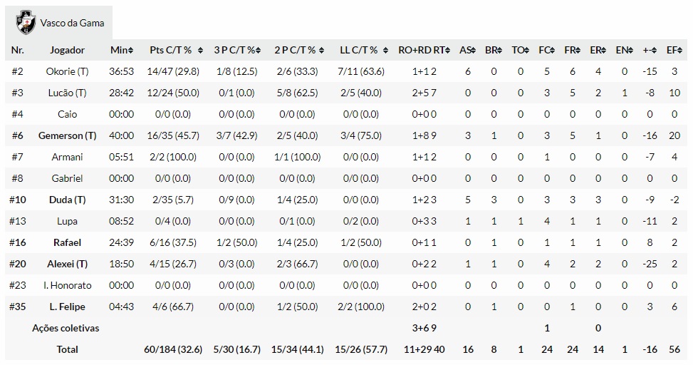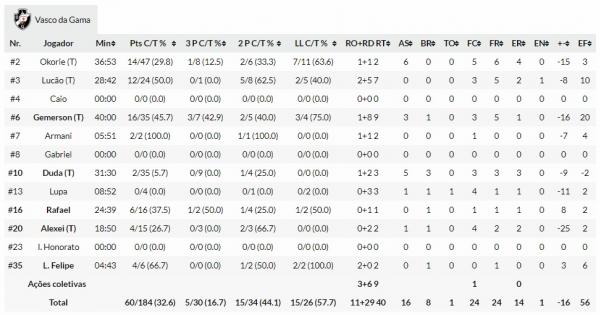 Além de Léo, Guilherme terminou com 15 pontos e sete rebotes. Yago fez 11 pontos, com cinco rebotes e três assistências. No Vasco, Gemerson fez 16 pontos, com nove rebotes. Okorie fez 14, com seis assistências. Lucão anotou 12 pontos, com sete rebotes.