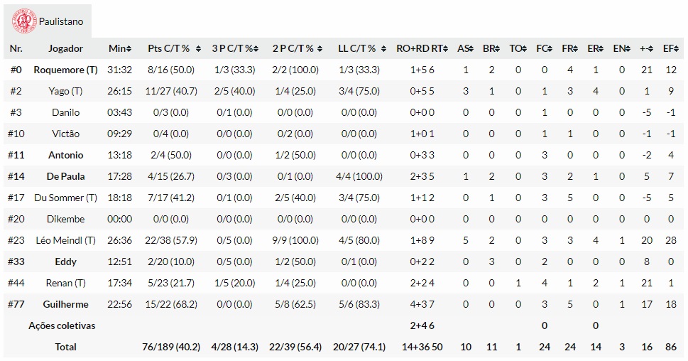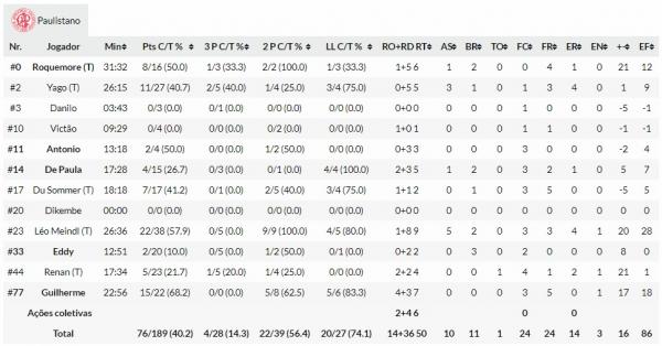 A melhora vascaína, contudo, ficou no terceiro quarto. Nos cinco minutos iniciais do último período, só deu Paulistano. Com uma parcial de 13 a 1, com Léo Meindl chegando aos 22 pontos, os visitantes colocaram 67 a 48 e praticamente resolveram a partida a seu favor. Nos últimos três minutos, o Vasco ainda tentou buscar com Okorie, mas a vantagem deu conforto ao Paulistano. Os paulistas, porém, perderam o armador Yago, que deixou a partida com uma torção no tornozelo direito. O placar final foi de 76 a 60.