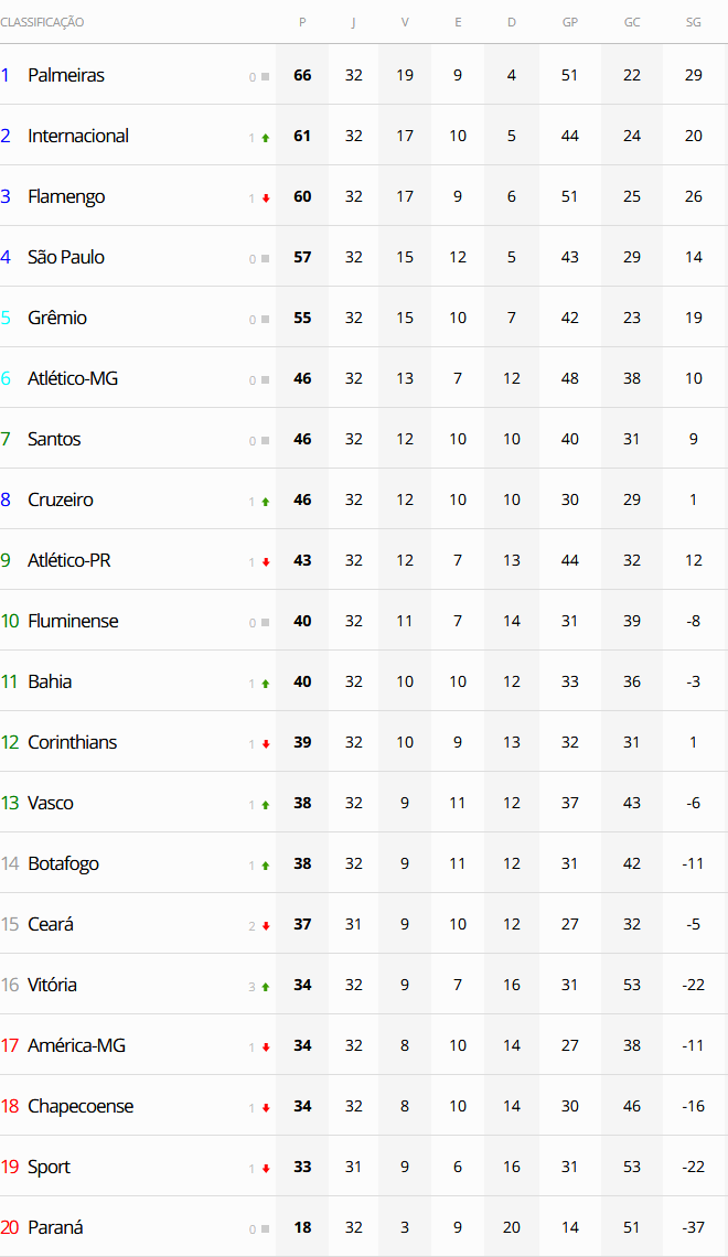 O Vasco, que venceu o Fluminense por 1 a 0 no sábado, terminou o fim de semana da 32ª rodada do Campeonato Brasileiro na 13ª colocação. Os vascaínos estão a 4 pontos da zona de rebaixamento. Nesta segunda-feira, o Ceará visita o Sport e poderá ultrapassar o Gigante da Colina em caso de empate ou vitória.