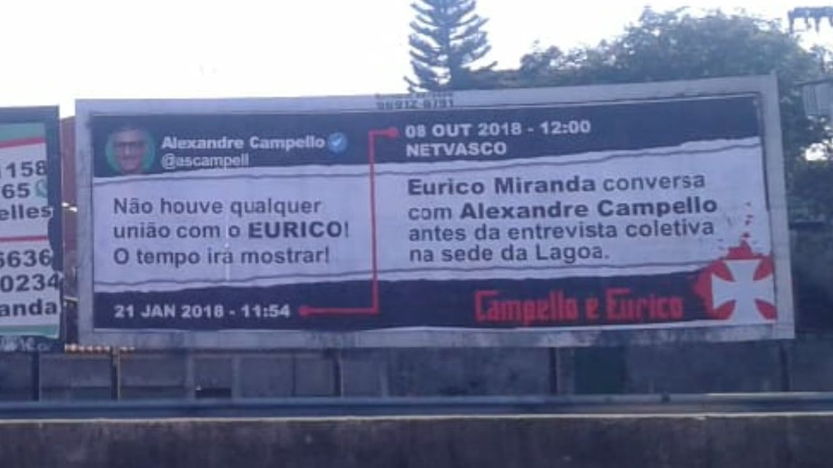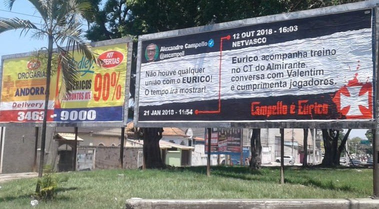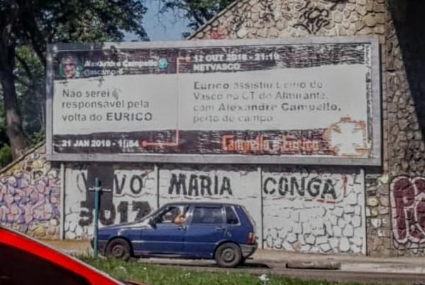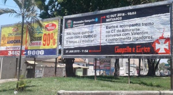 Outdoors no Rio de Janeiro foram ocupados desde o fim de semana com um protesto contra Alexandre Campello, presidente do Vasco. Em diversos pontos da cidade há reprodução de um tweet de Campello de janeiro deste ano dizendo que não seria responsável pela volta de Eurico Miranda, ex-presidente do clube e atual mandatário do Conselho de Beneméritos, ao lado de um contraponto de outubro e a frase "Campello é Eurico" (confira algumas imagens na galeria acima).