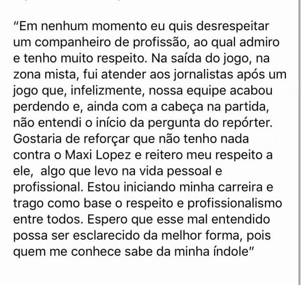 Richard: 'Gostaria de reforçar que não tenho nada contra o Maxi López e reitero meu respeito a ele'