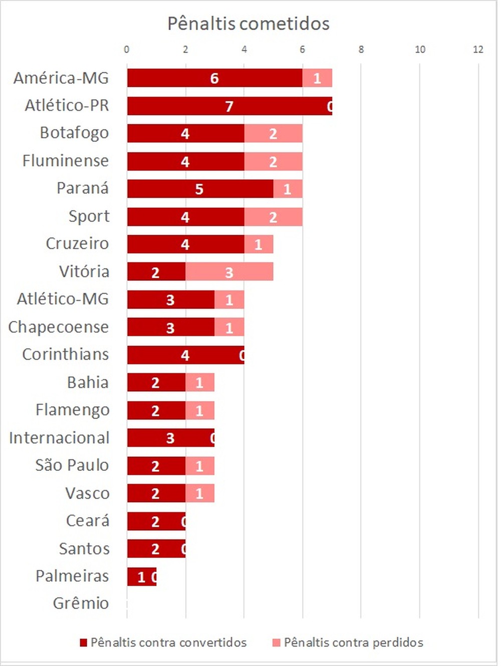 E por falar em extremo, o Grêmio sobra. Com 11 pênaltis a favor, a equipe gaúcha não teve qualquer pênalti marcado contra sua defesa. O líder Palmeiras só teve um marcado contra.