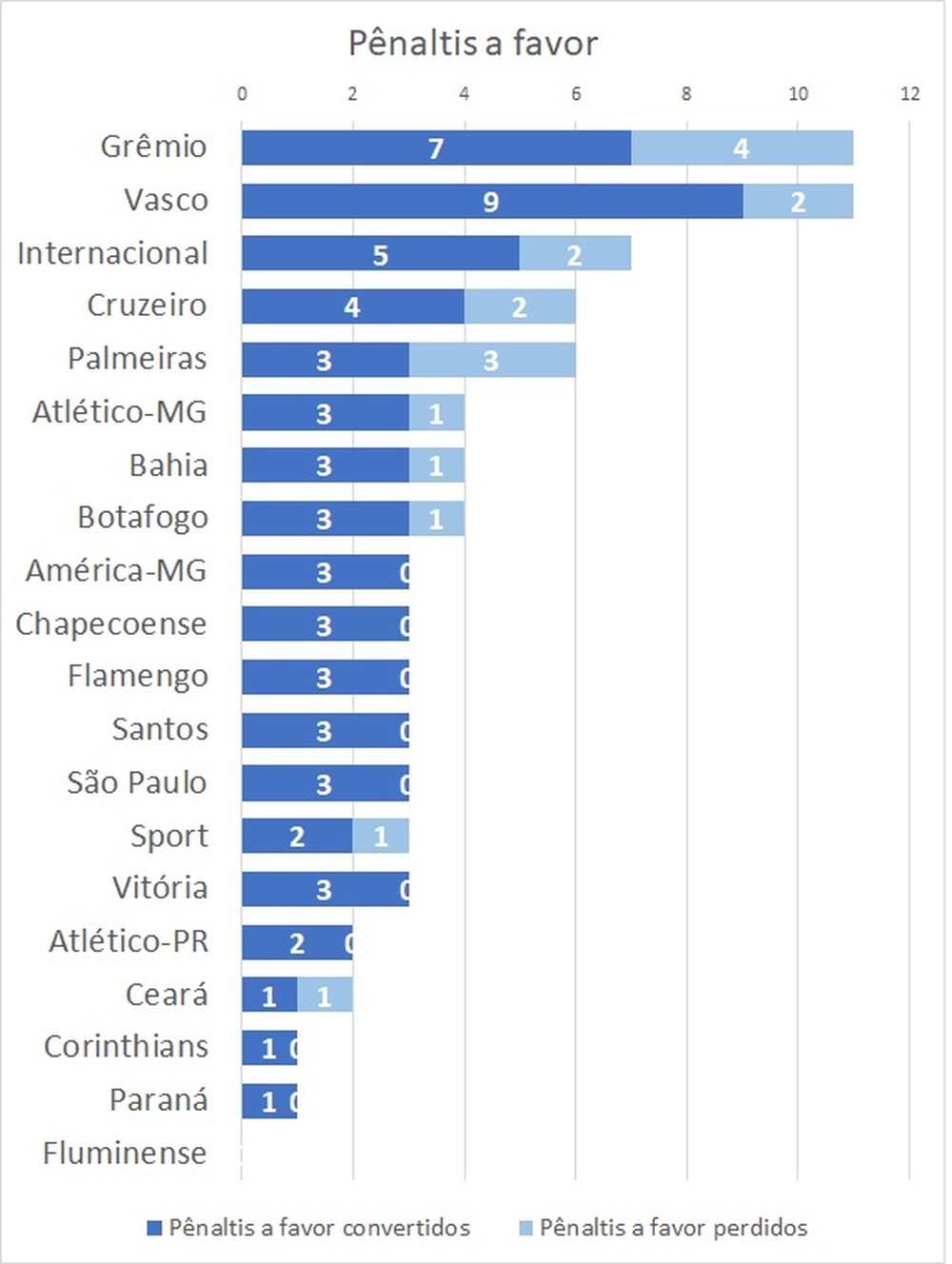 De cada quatro pênaltis marcados no Brasileirão, um foi apontado a favor de Grêmio ou Vasco. Foram 80 penalidades marcadas na competição, e cada um deles teve 11 a seu favor. Com sete pênaltis a favor, América-MG, Atlético-PR e Internacional estão na terceira colocação como as equipes com mais penais para cobrar. No outro extremo está o Fluminense, que não fez qualquer cobrança de pênalti no Brasileiro.